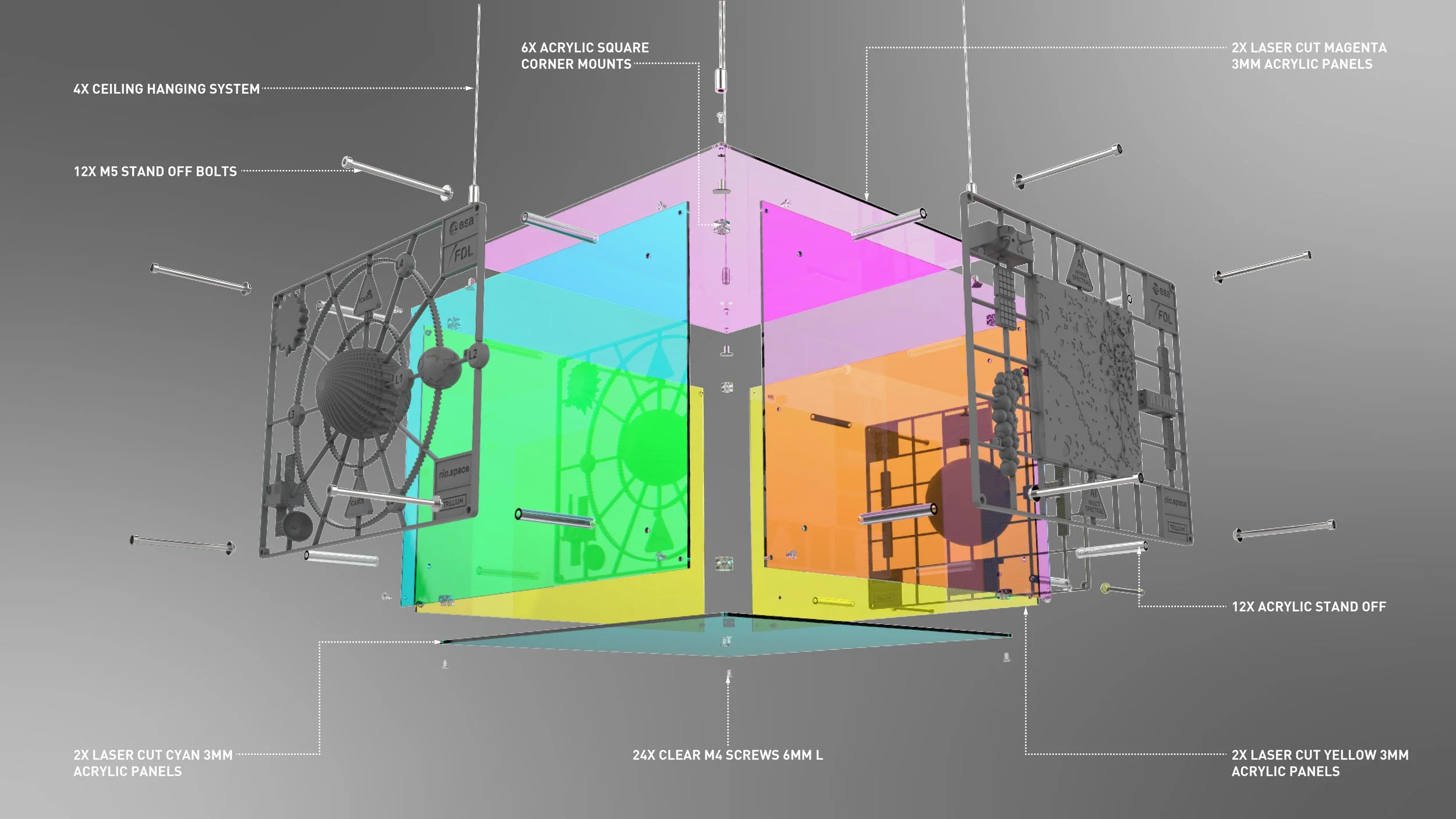The panels are precision-engineered from tinted Perspex, intentionally chosen for their interaction with natural light. As sunlight filters through the structure, it casts chromatic shadows that shift across surfaces—echoing the evolving, multi-scale nature of AI-driven insights in space. This interplay of transparency, colour, and geometry invites visitors to move around the piece, discovering new perspectives, arguably a core idea of an in-space intelligence fabric.